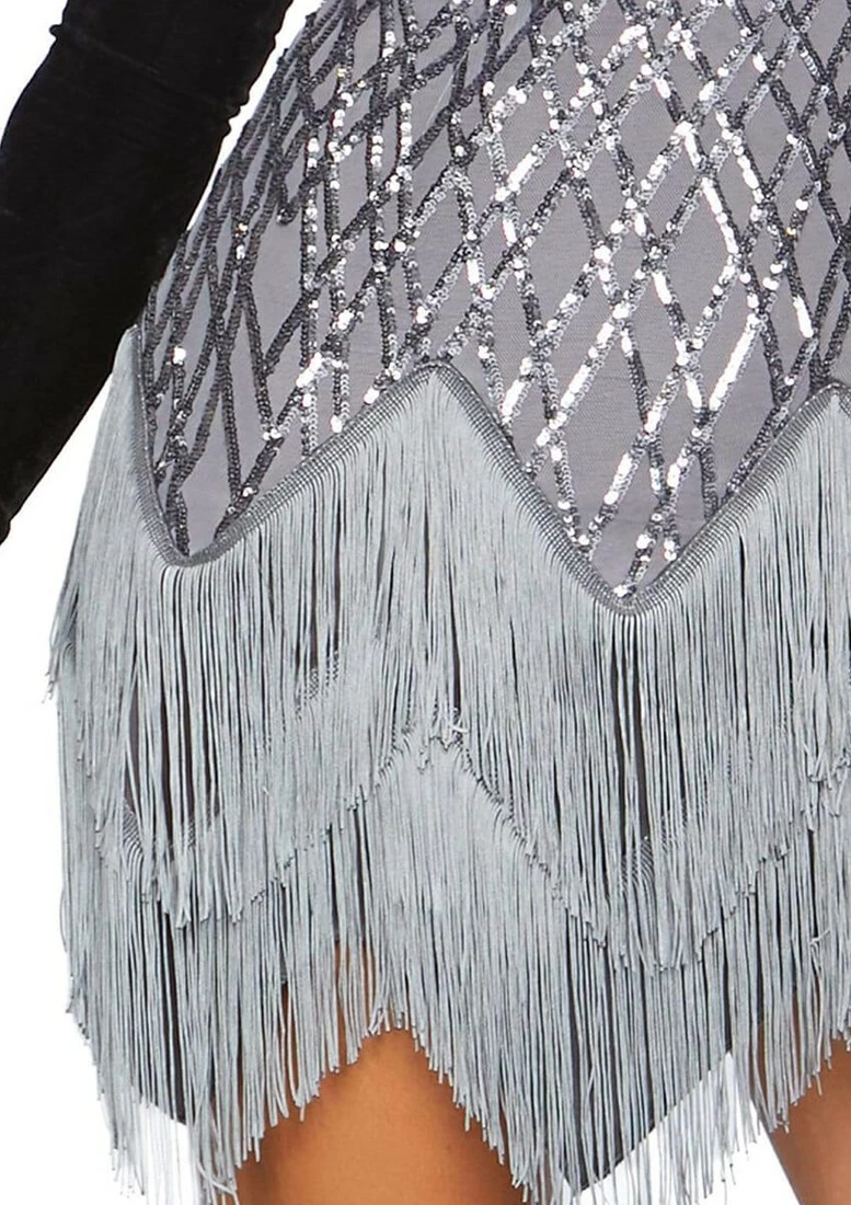 Details: jurk met diepe V hals en een zoom met zigzag rand, pailletten en zigzag franjes