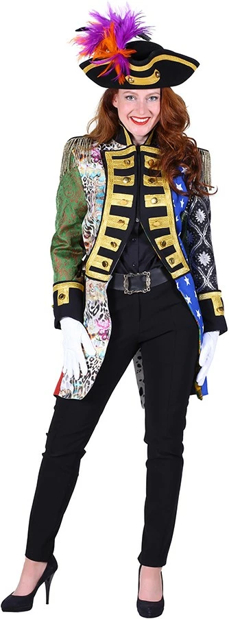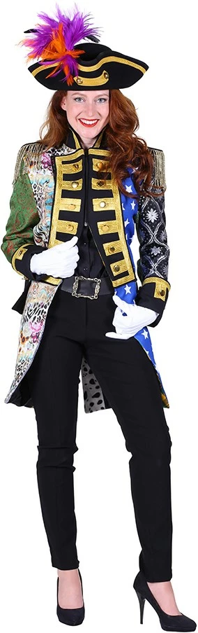 Details: de jas is afgewerkt met goudkleurig band. Op de schouders zitten zwarte epauletten met goudkleurige franjes, de epauletten zitten vast met een knoop.