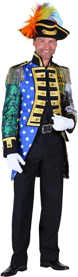 Details: de jas is afgewerkt met goudkleurig band. Op de schouders zitten zwarte epauletten met goudkleurige franjes, de epauletten zitten vast met een knoop.