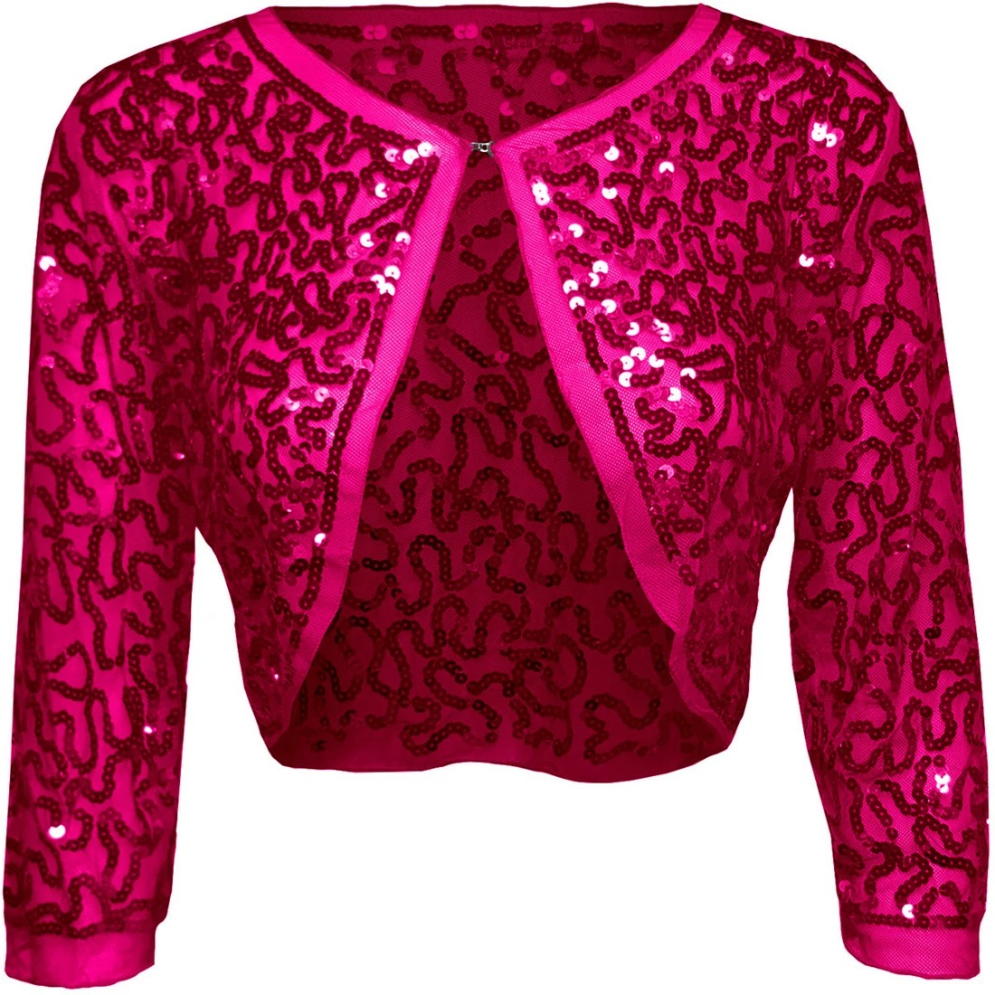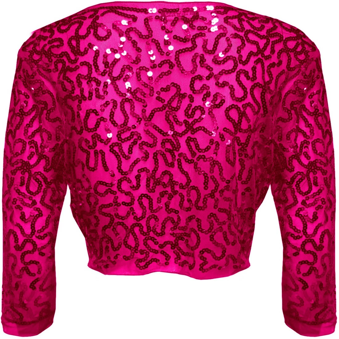 Een mooie pink kleurige bolero met pink kleurige pailletten. De bolero sluit aan de voorkant doormiddel van een klein haakje. Ook verkrijgbaar in andere kleuren.