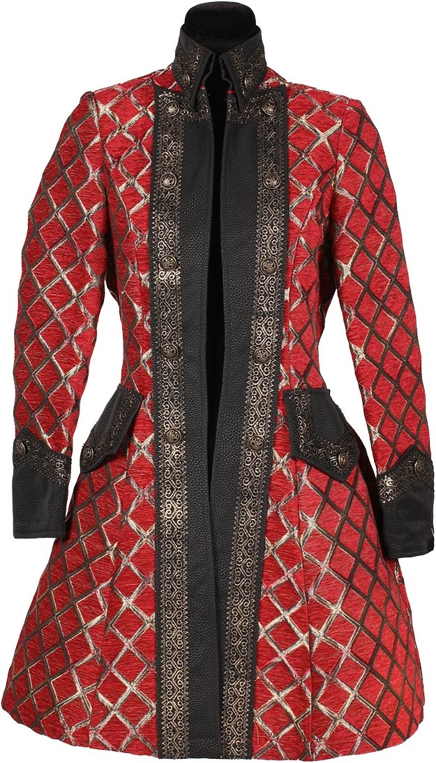 Details: hals, borst, polsen en zakken afgewerkt met een nep leren stof en sierlijk lint en knopen