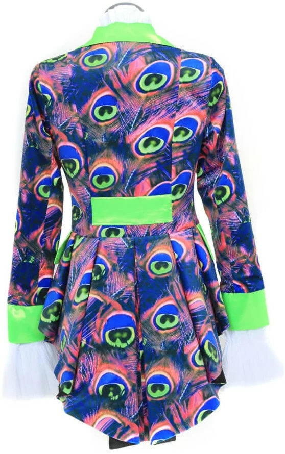 Details: de voorkant van de jas is kort wat langer door loopt naar achteren. De kraag, mouwen en zakken zijn in een effen neon kleur