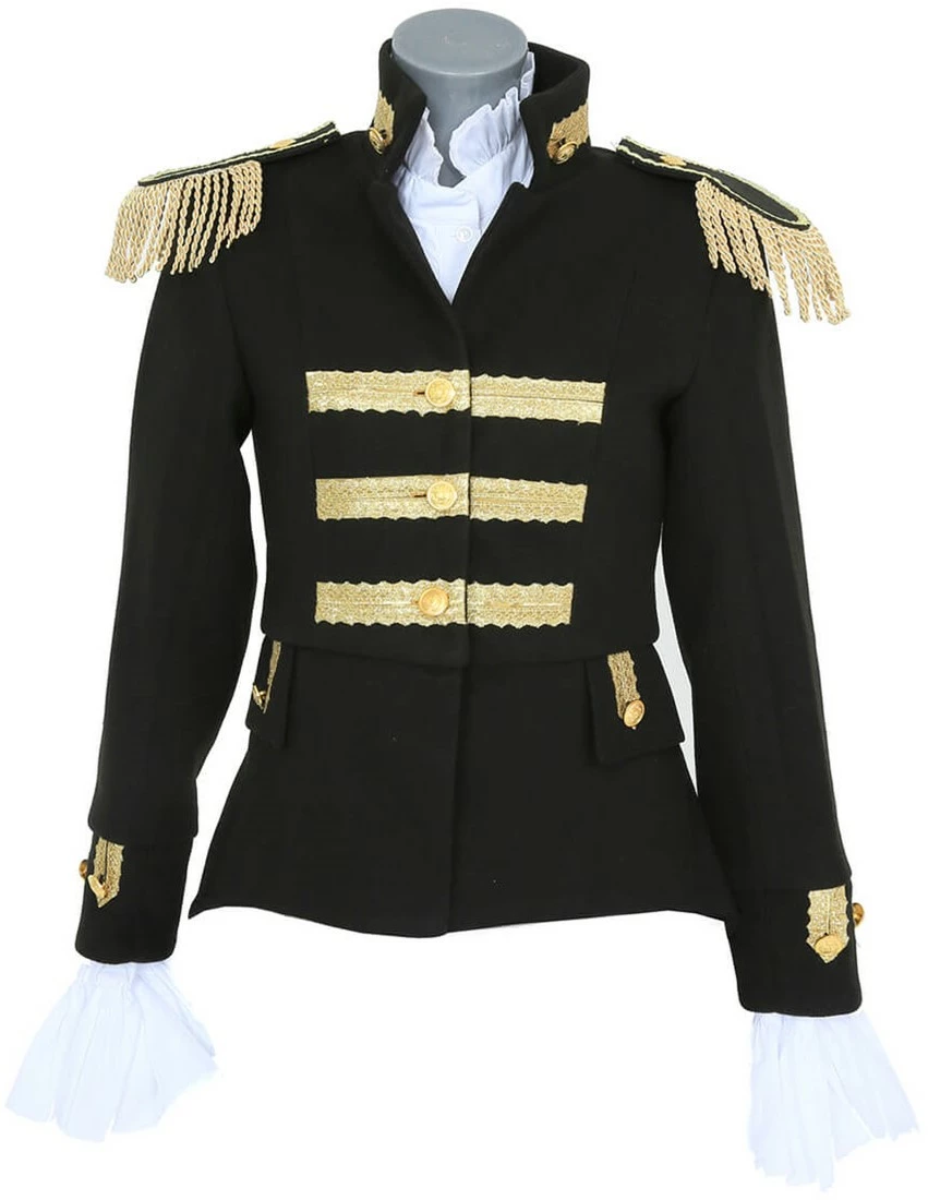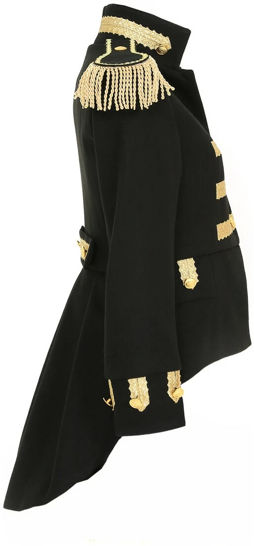 Details: Op de schouders zitten epauletten en de achterkant van de jas loopt langer door. De nek, armen en borst zijn afgewerkt met gouden galon