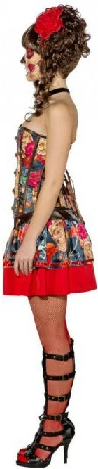 Mooie rok die zeer geschikt is voor het thema dag van de doden! De rok is gemaakt van 70% polyester en 30% polyurethaan. De rok bestaat uit een bloemenprint met schedels, rood onderrokje en een lederlook riem. De netpanty en pruik zijn apart verkrijgbaar. Let op: de rok wordt exclusief korset en cape geleverd.