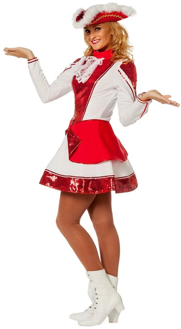 Details: de rode stroken op het kostuum zijn voorzien van rode glinsterende pailletten. Dit geeft het kostuum een mooi effect. Alleen de kraag en de rode flap over de rok zijn niet voorzien van pailletten. Tot slot zit er een kanten jabotje aan dit kostuum
