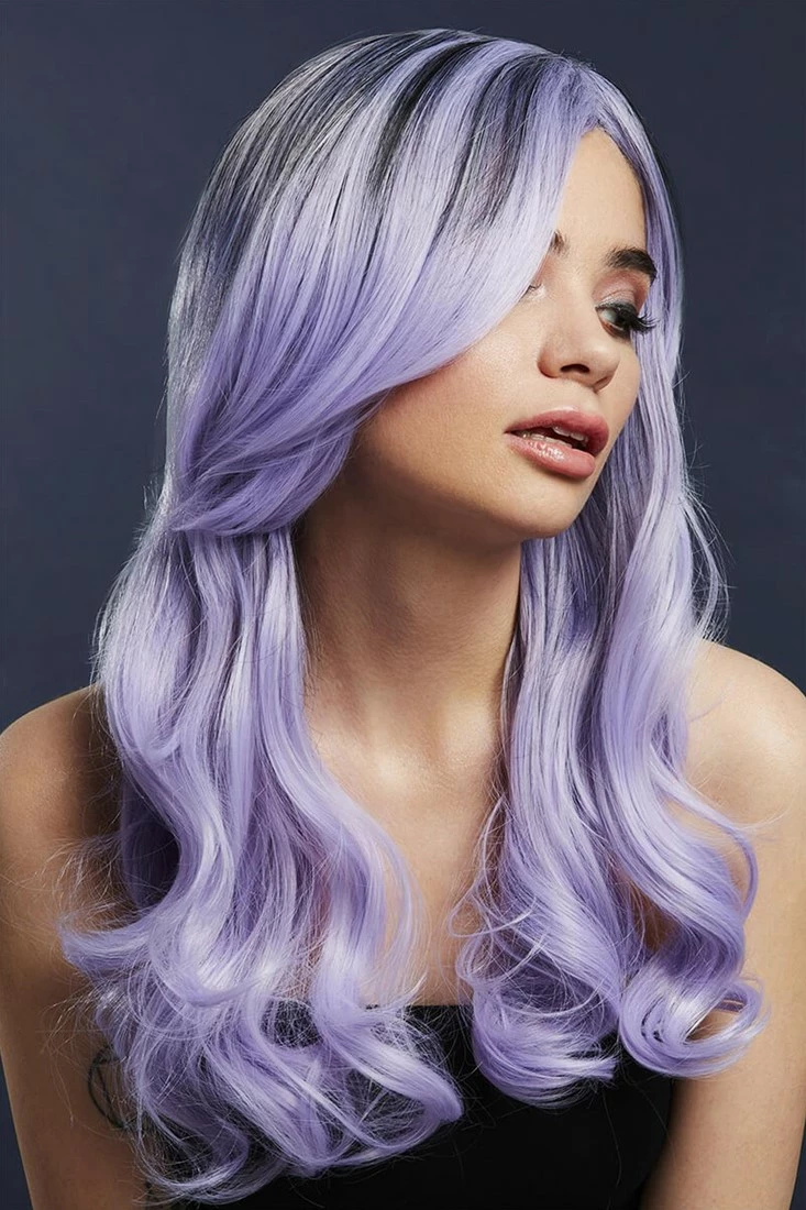 Een lange lila kleurige pruik met laagjes en mooie krullen. De pruik is circa 66 centimeter lang en in meerdere kleuren verkrijgbaar. Deze prachtige pruik maakt deel uit van de Fever Wig Collection. Dit is een collectie met kwalitatieve en realistische pruiken.