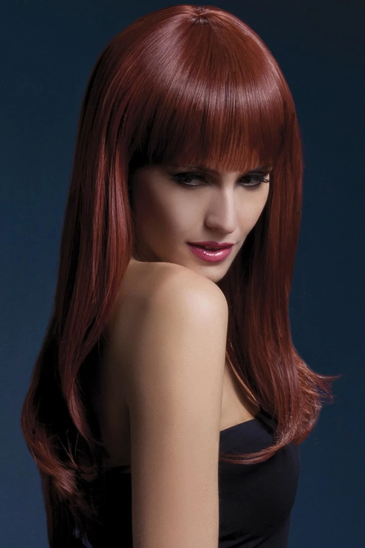 Een lange kastanjebruine pruik van 66 centimeter met laagjes, een pony en lichte krullen. De pruik is in meerdere kleuren verkrijgbaar. Deze prachtige pruik maakt deel uit van de Fever Wig Collection. Dit is een collectie met kwalitatieve en realistische pruiken.