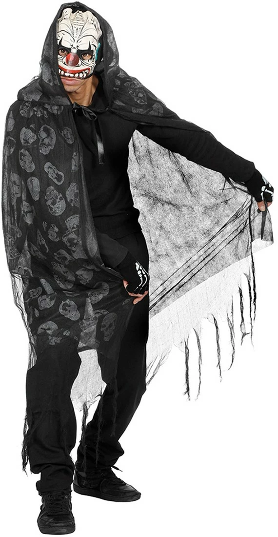 Een gruwelijke cape met een verweerde look en allemaal skulls! De cape is perfect om snel klaar te zijn voor Halloween.