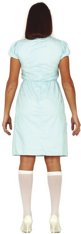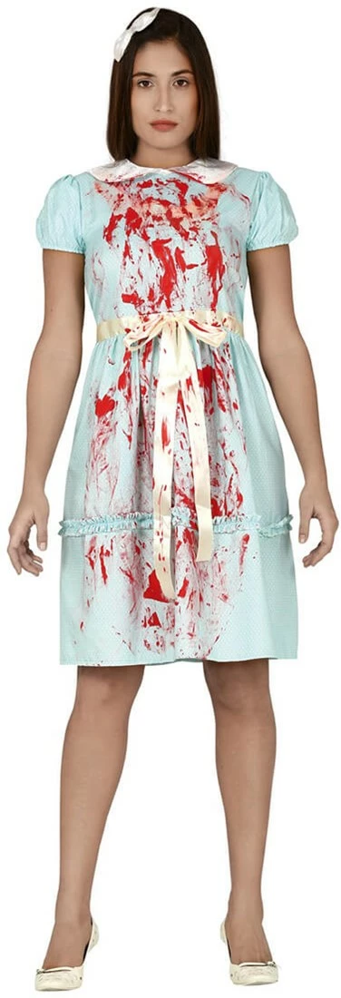 Details: de jurk heeft een witte kraag en is besmeurd met “bloedvlekken”