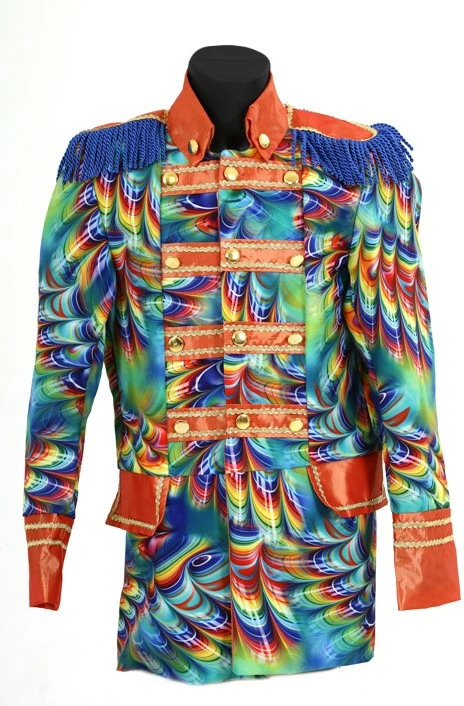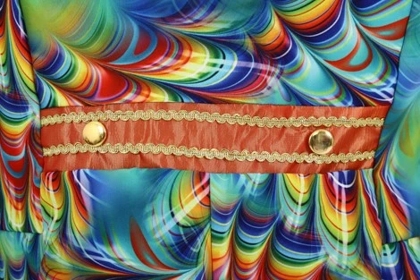 Details: oranje metallic stroken voorzien van gouden details en goudkleurige knopen. Ook de uiteinde van de mouwen en de kraag is oranje metallic met gouden details en goudkleurige knopen.