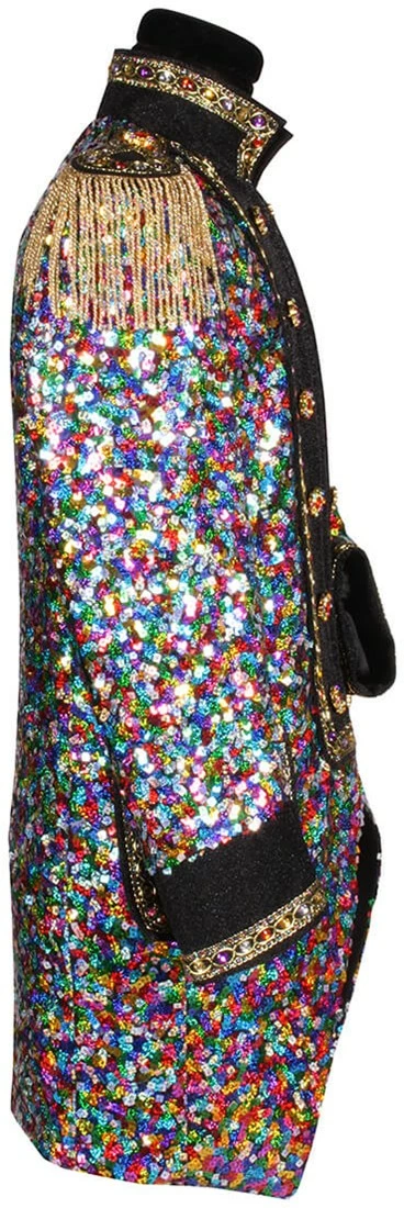 Details: allemaal gekleurde pailletten en de hals, borst, polsen en epauletten zijn versierd met multi gekleurd band.