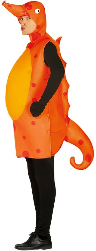 Een superleuk kostuum in de vorm van een oranje zeepaardje! Gemaakt van foam, met een capuchon in de vorm van de snuit en een staartje achterop. Dit artikel is leverbaar is één maat, maat L.