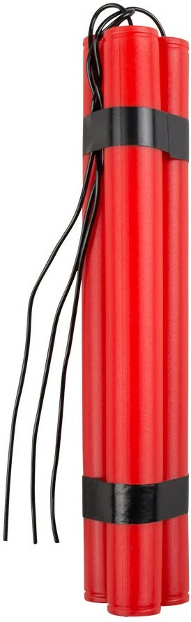 Details: 3 dynamiet staven zijn met zwart tape aan elkaar verbonden en hebben zwarte nep lonten