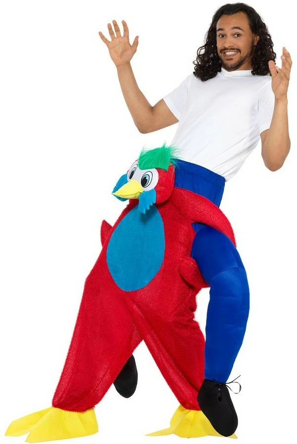 Dit hilarische kostuum doet het net lijken alsof je wordt gedragen door een papegaai! Dit kostuum bestaat uit één geheel en is dus alleen het onderstuk. Het kostuum bestaat dus uit de papegaai en de over de schouders hangende blauwe (gevulde) broek.