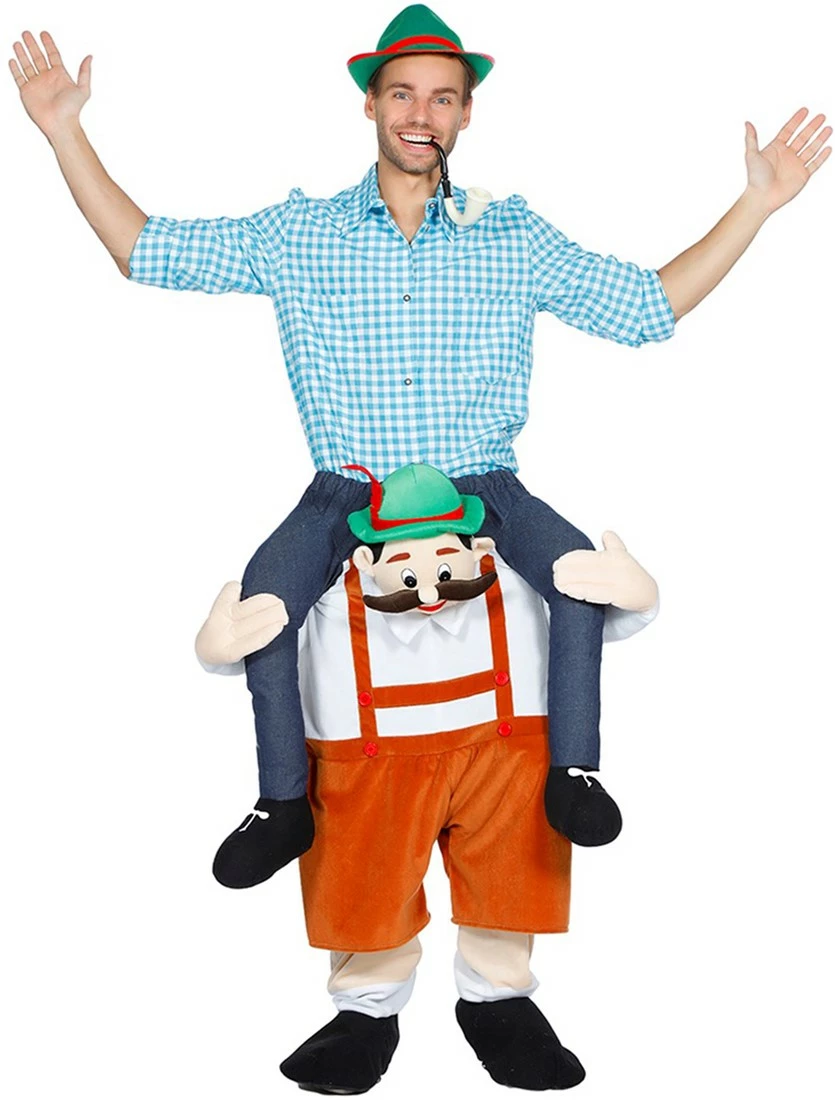 Dit hilarische kostuum doet het net lijken alsof je wordt gedragen door een Tiroler man! Een supergaaf idee om aan te doen naar een Oktoberfest. Dit kostuum bestaat uit één geheel en is dus alleen het onderstuk. Het kostuum bestaat dus uit de Tiroler pop en de over de schouders hangende spijkerstof-blauwe (gevulde) broek.
