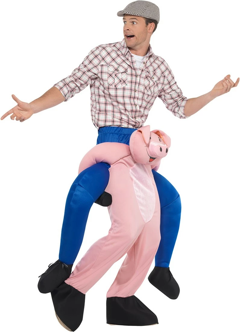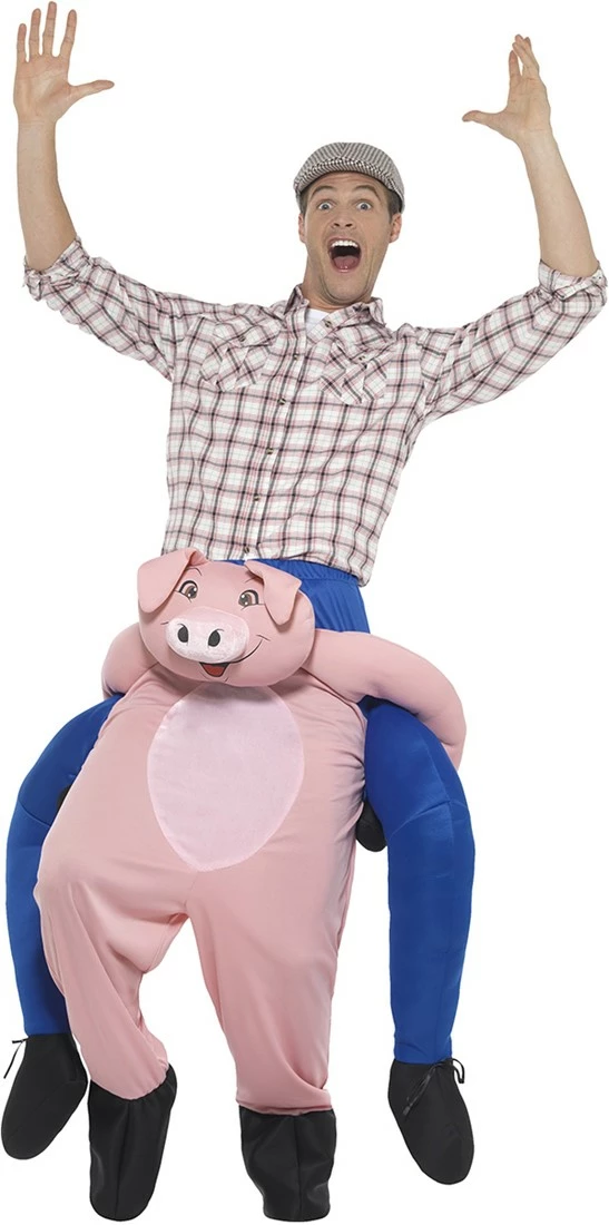 Dit hilarische kostuum doet het net lijken alsof je wordt gedragen door een varken! 🐷 Dit kostuum bestaat uit één geheel en is dus alleen het onderstuk. Het kostuum bestaat dus uit de varken en de over de schouders hangende blauwe (gevulde) broek.