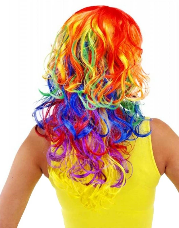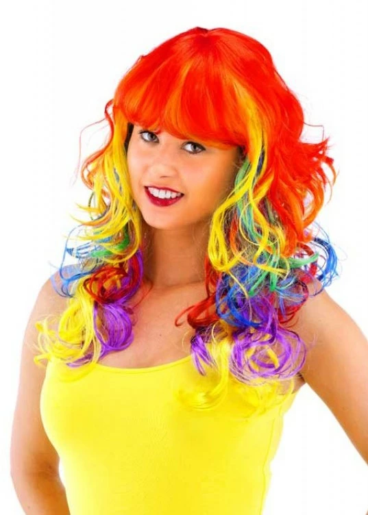 Deze kleurige damespruik heeft een pony en lang, krullend haar in een kleuren regenboog.