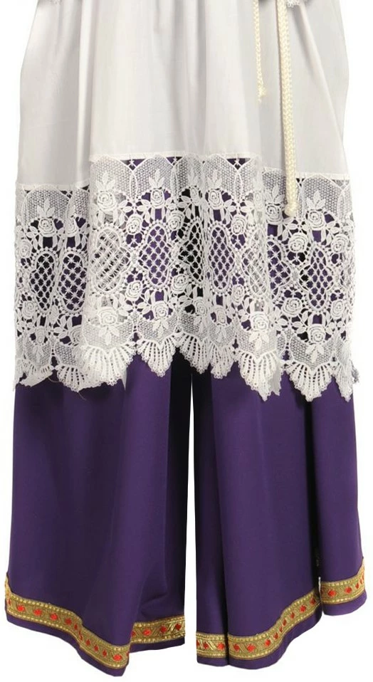 Deze paarse broekrok maakt jouw sinterklaas kostuum helemaal af! De weide broekrok heeft aan de uiteindes van de broekspijpen een gouden detail met rood erin verwekt. Door middel van een koord in de broekrok is deze in breedte te verstellen. Verder is de broekrok gemaakt van 100% polyester.