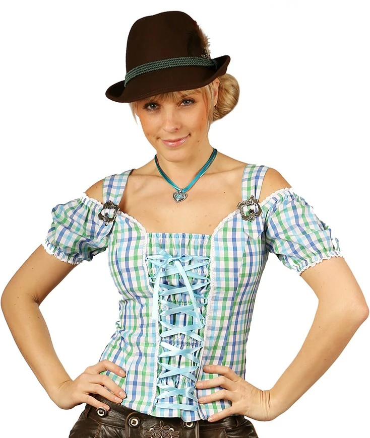 Deze tirolerblouse heeft een mooi blauw/groen geblokt motief en een prachtig satijnen lint aan de voorzijde. De blouse is te sluiten door middel van een rits aan de achterkant. Ook verkrijgbaar in het pink/groen. Gemaakt van 55% polyester en 45% katoen.