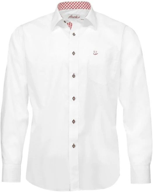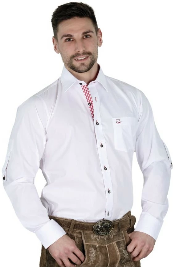 Een mooie witte trachten overhemd met rode details in de nek en bij de mouwen. Dit overhemd heeft een borstzakje aan de linkerkant.