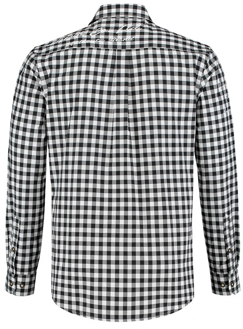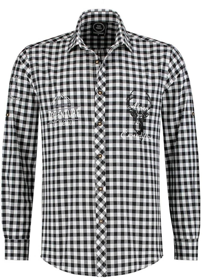 Een erg mooi trachtenhemd voor heren met een zwart/wit geblokt patroon en traditionele borduursels. Staat geweldig bij een grijze/grauwe lederhose.