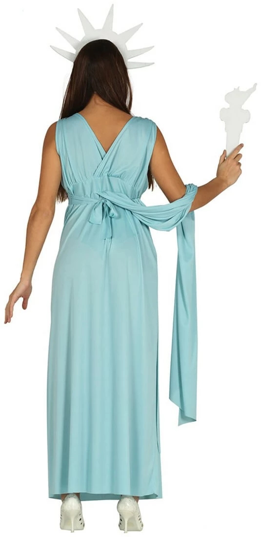 Details: lange jurk met v hals. Een sleep bedekt de schouder en versiert de voorkant van de jurk, en heeft de vorm van een cape aan de achterkant.